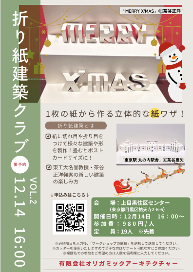 さて、上記のイベントでは先行してチラシをお渡しさせていただきましたが12月14日(土)に折り紙建築ワークショップを開催いたします!